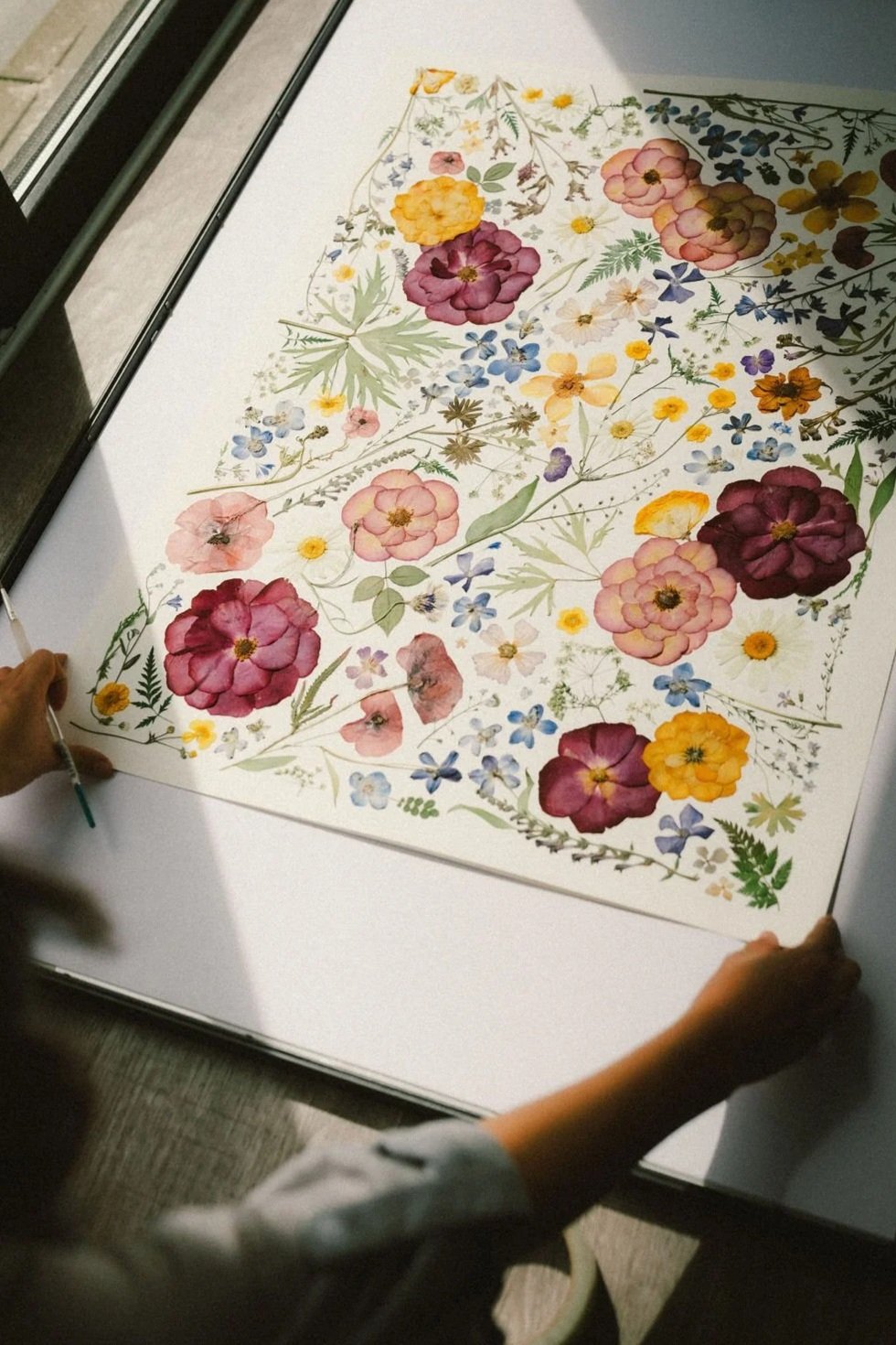 Your pressed flowers on a solid white acid-free background with clear glass front (option to upgrade to UV glass), and your choice of walnut or maple frame.
